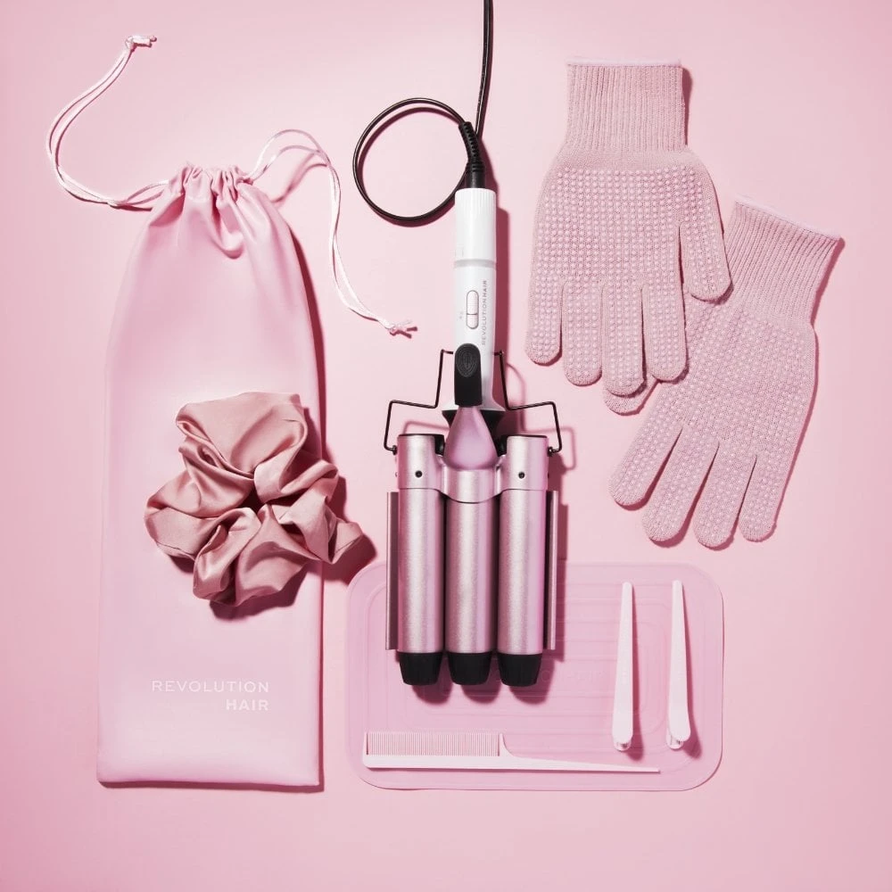 - This kit also includes pink heat protection gloves and a matt, along with pink section clips, a pink tailcomb and an XL pink satin scrunchie alongside a travel bag.