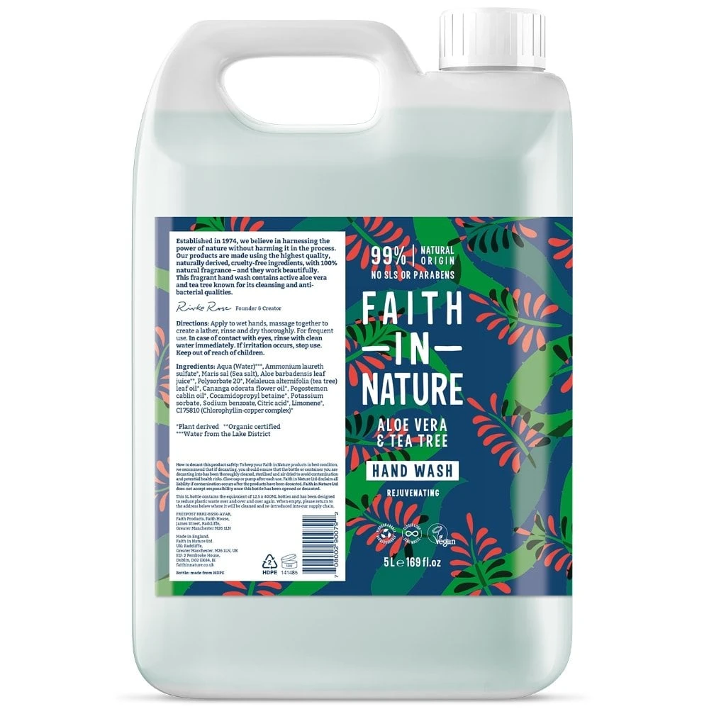 Faith In Nature Aloe Vera & Tea Tree Hand Wash (5000ml) is a caring, vegan hand wash which cleanses gently without stripping the skin of its natural oils.