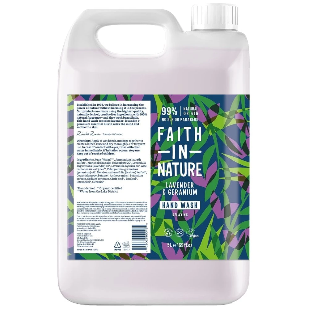 Faith In Nature Lavender & Geranium Hand Wash (5000ml) is a relaxing, vegan hand wash which cleanses gently without stripping the skin of its natural oils.