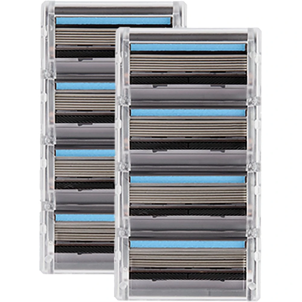 These L-Shaped blades have been designed for rinse-through cleaning and come with a lubricating Vegan Aloe Vera strip to avoid irritation and provide a comfortable glide. Engineered in Germany. Cruelty-free & vegan-friendly.