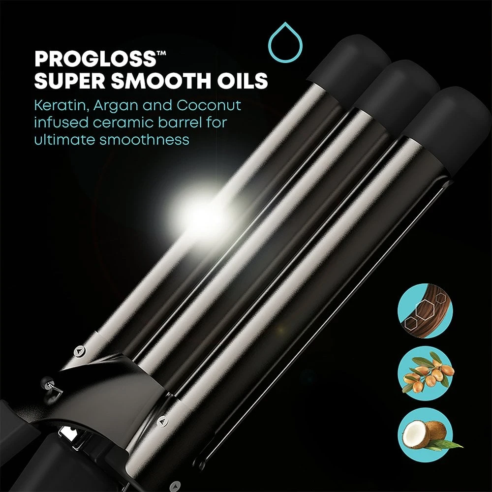 - Progloss™ super smooth oils Keratin, Argan and Coconut infused ceramic barrels for ultimate smoothness.