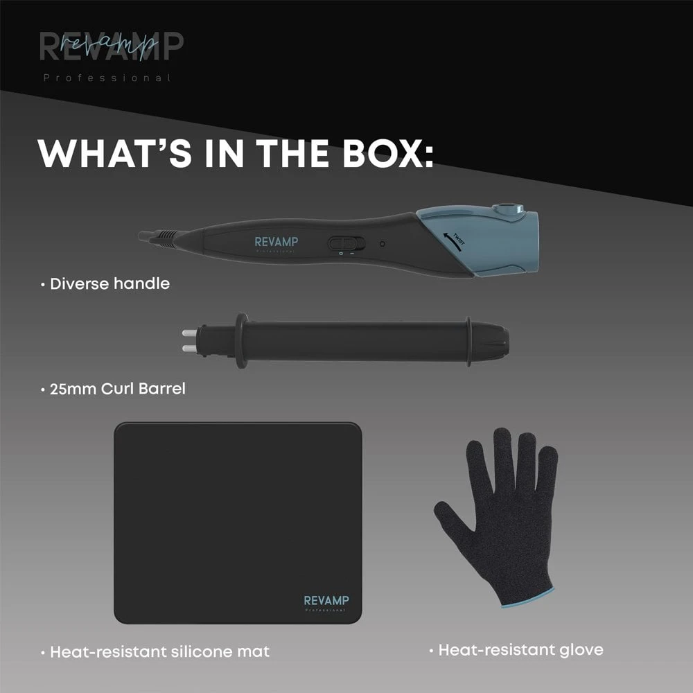 Revamp Progloss Diverse Twist & Swivel Handle With 25mm Curl Barrel has been designed with a unique twist and swivel handle which can be used together with varying wand attachments to create versatile hair styles from loose beachy waves to tight chopstick curls. Supplied with a 25mm regular curl barrel, the wand can be twisted at 90° to reach any section of hair.